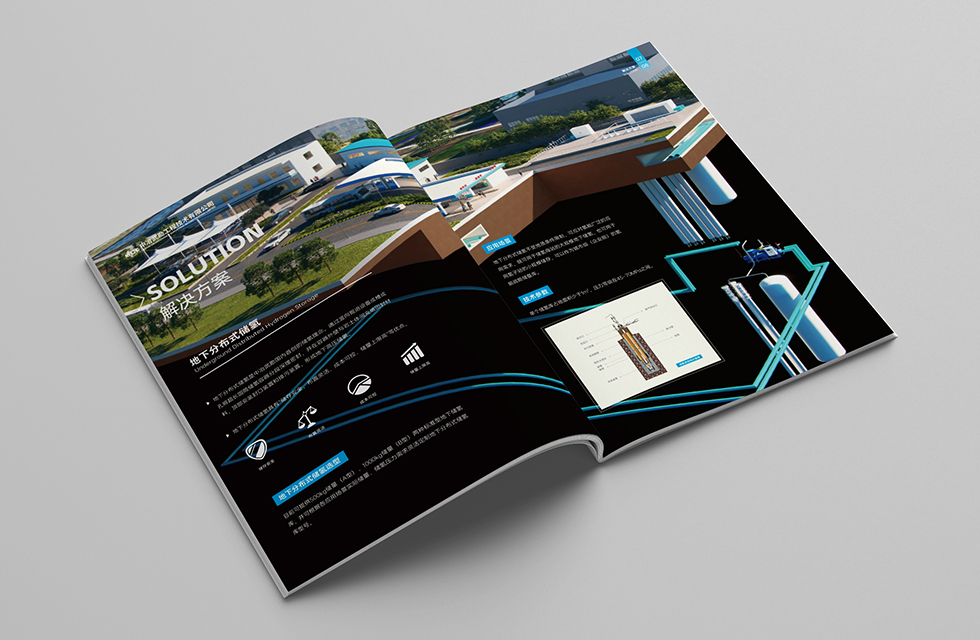 項(xiàng)目背景:中冶武勘堅(jiān)持“冶金勘察國家隊(duì),資源保障主力軍,基本建設(shè)排頭兵,巖土工程、智慧應(yīng)用、資源勘查領(lǐng)域具有特色的工程綜合服務(wù)提供商”戰(zhàn)略定位,依托測繪、勘察、檢測監(jiān)測、巖土工程等傳統(tǒng)主業(yè)核心基礎(chǔ)支撐,積極打造工程總承包、智慧應(yīng)用、能源環(huán)保、資源開發(fā)四大業(yè)務(wù)板塊,構(gòu)建傳統(tǒng)主業(yè)及資源勘查與礦山建設(shè)、智慧應(yīng)用、地下空間開發(fā)、巖土工程一體化、新能源工程、生態(tài)環(huán)境治理、特色基礎(chǔ)設(shè)施建設(shè)八個業(yè)務(wù)方向,為客戶提供集規(guī)劃、投資、建設(shè)、運(yùn)維為一體的工程全生命周期服務(wù)。艾的爾設(shè)計(jì)接受其委托,承接畫冊設(shè)計(jì)項(xiàng)目。在畫冊設(shè)計(jì)、創(chuàng)意的過程中,設(shè)計(jì)師通過對行業(yè)屬性進(jìn)行深入地了解,根據(jù)企業(yè)屬性,進(jìn)行了畫冊設(shè)計(jì)、創(chuàng)意。在畫冊封面設(shè)計(jì)中,選用具有深地儲氫系統(tǒng)代表性且現(xiàn)代感、企業(yè)化的圖片組合成‘H’和‘M’,‘H’代表氫能源,則右側(cè)設(shè)計(jì)感的‘M’代表MCC,對字母組合進(jìn)行藝術(shù)化設(shè)計(jì),使得整個封面具有嚴(yán)謹(jǐn)、穩(wěn)重的風(fēng)格,大膽留白凸顯字母‘H’和‘M’,展現(xiàn)了企業(yè)的經(jīng)營業(yè)務(wù)和追求科技以及嚴(yán)謹(jǐn)負(fù)責(zé)的工作態(tài)度。封面字體設(shè)計(jì)干凈利落,藍(lán)色代表理性科技,契合企業(yè)形象。在內(nèi)頁的設(shè)計(jì)中,按黃金分割比例設(shè)計(jì),標(biāo)題與文字的板塊相互呼應(yīng)文圖分布疏密有致,整個版面簡潔優(yōu)雅。畫冊內(nèi)頁的顏色選用上,和封面相互呼應(yīng),以藍(lán)白等清新雅致的顏色為主。整個畫冊,設(shè)計(jì)精簡、嚴(yán)格,充分展現(xiàn)出了企業(yè)的訴求和形象。